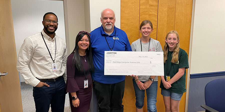 (L to R) Sempangi, Director of Human Resources for AMETEK AMT; Jenny, HR & Payroll Specialist for AMETEK AMT; the founder and members of Oak Ridge Computer Science Girls 关于 Sensors and Fluid Management Systems