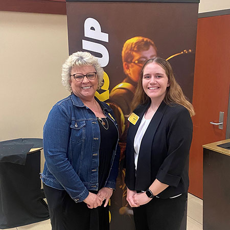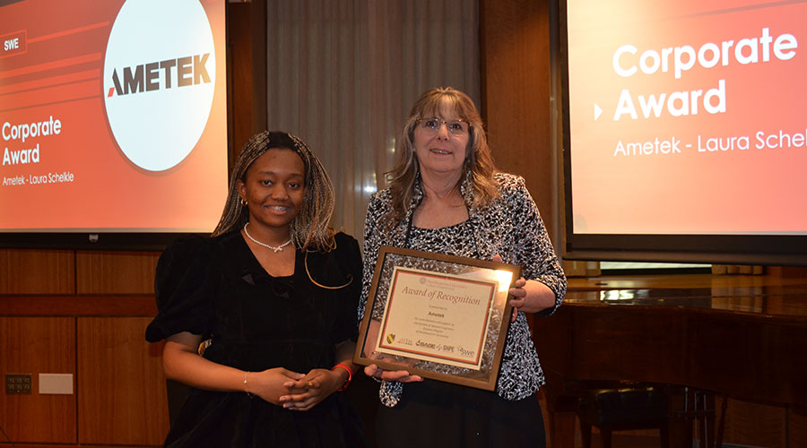 Laura, Senior Manager of Human Resources at AMETEK SFMS (right) accepting an award from SWE for SFMS’s over 10-year partnership AMETEK PDS supports scholarship at Wichita State University